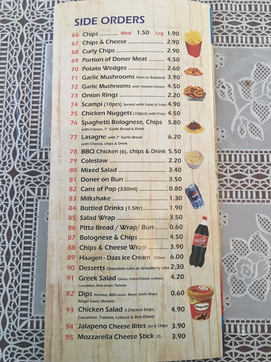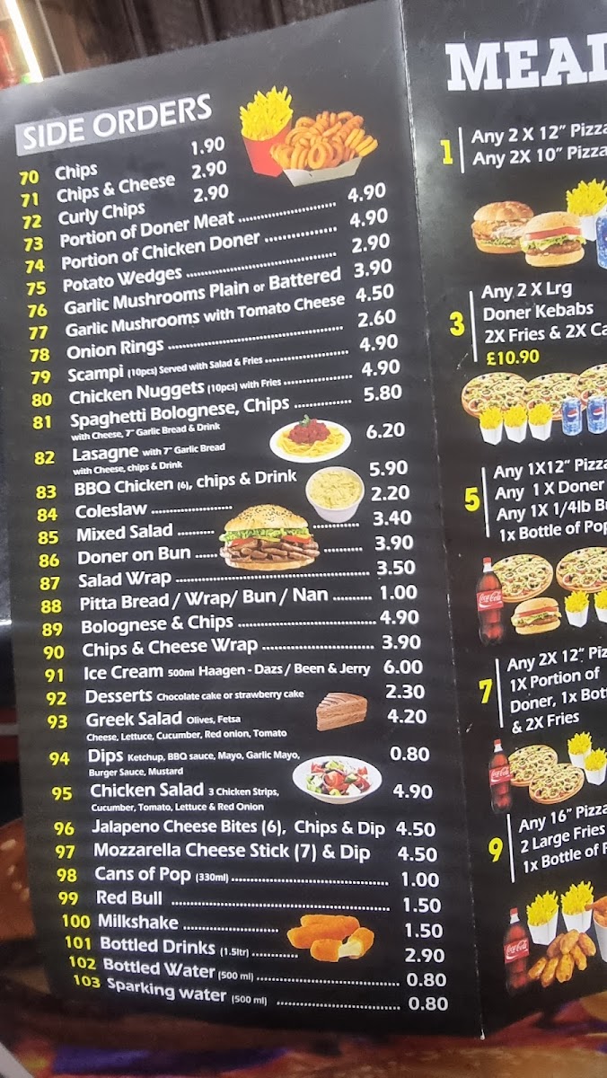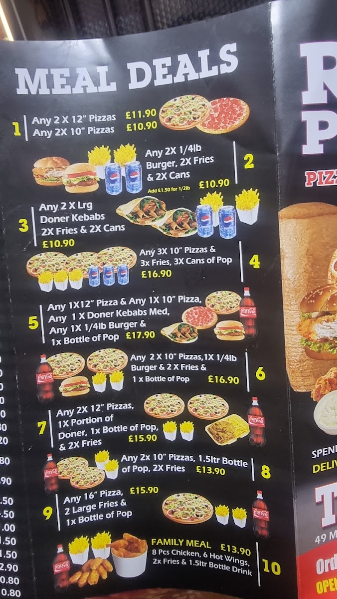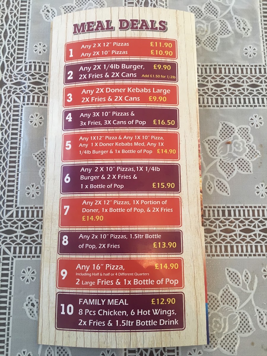 Any 12inch pizza, any 10inch pizza, Medium donner kebab, any quarter pounder burger and 1x bottle of pop
