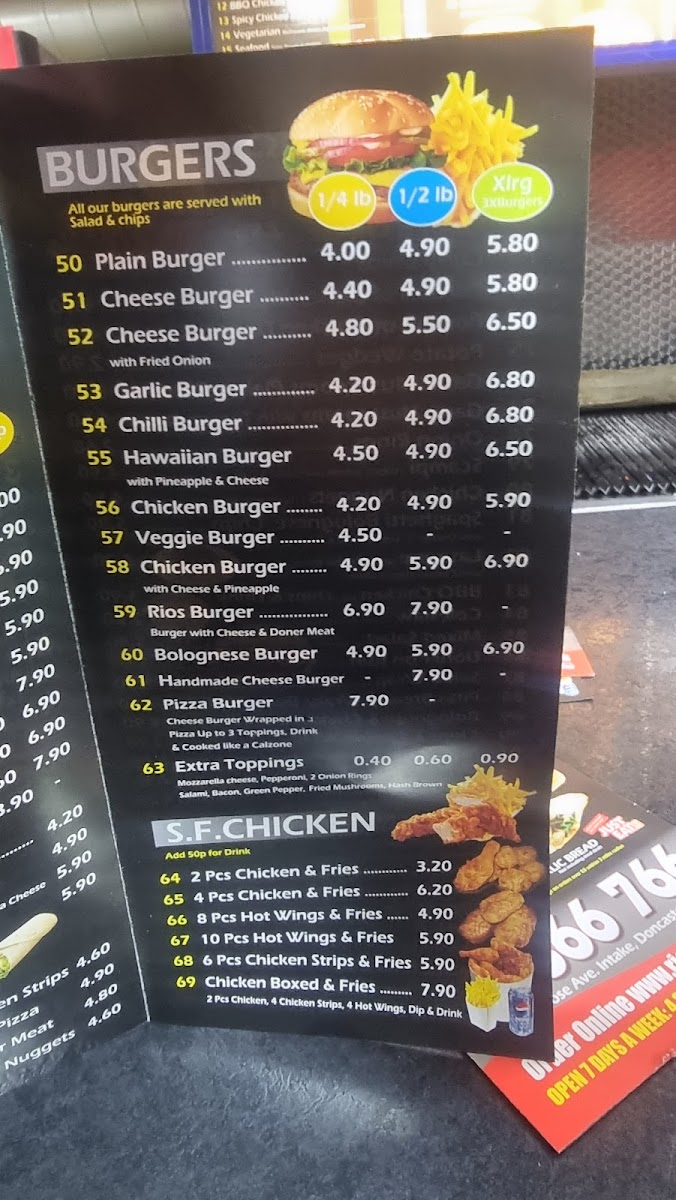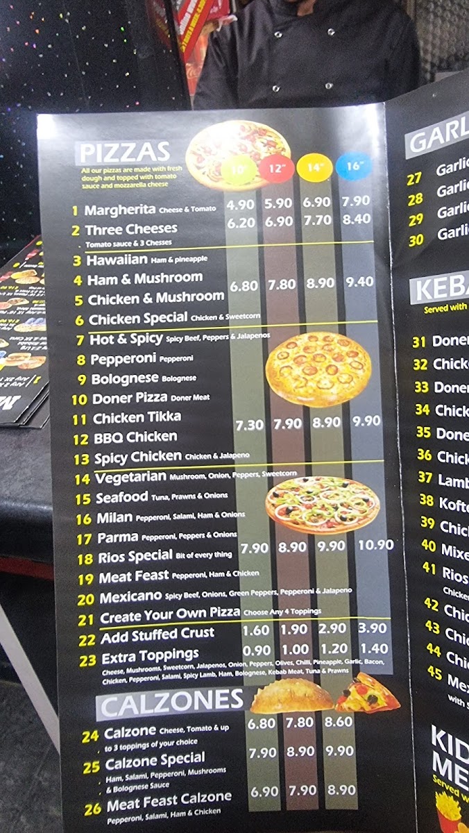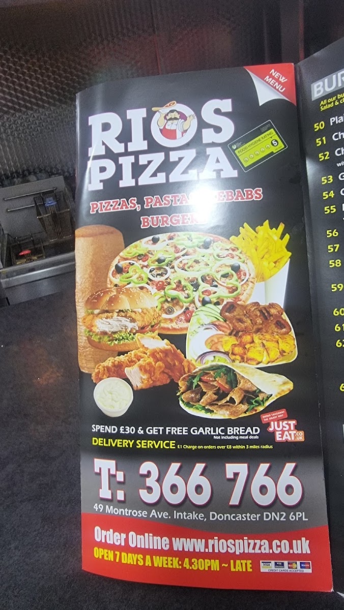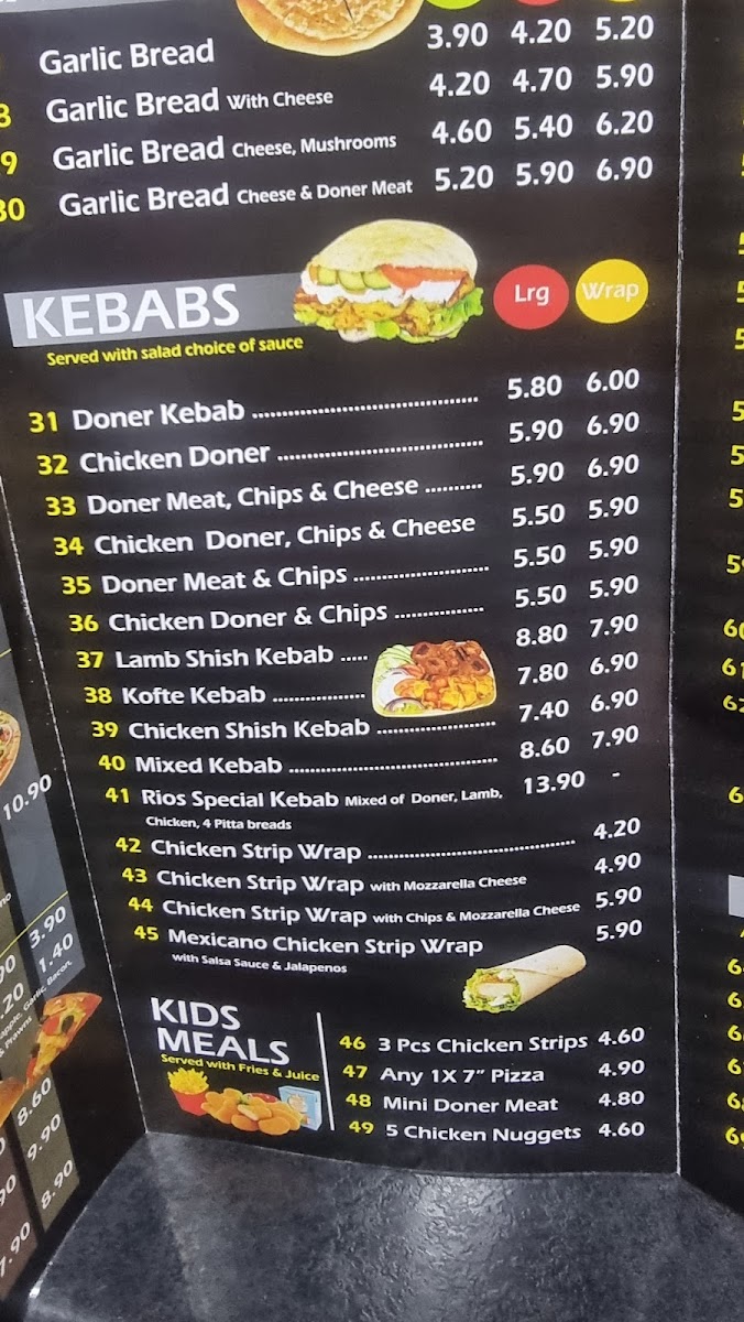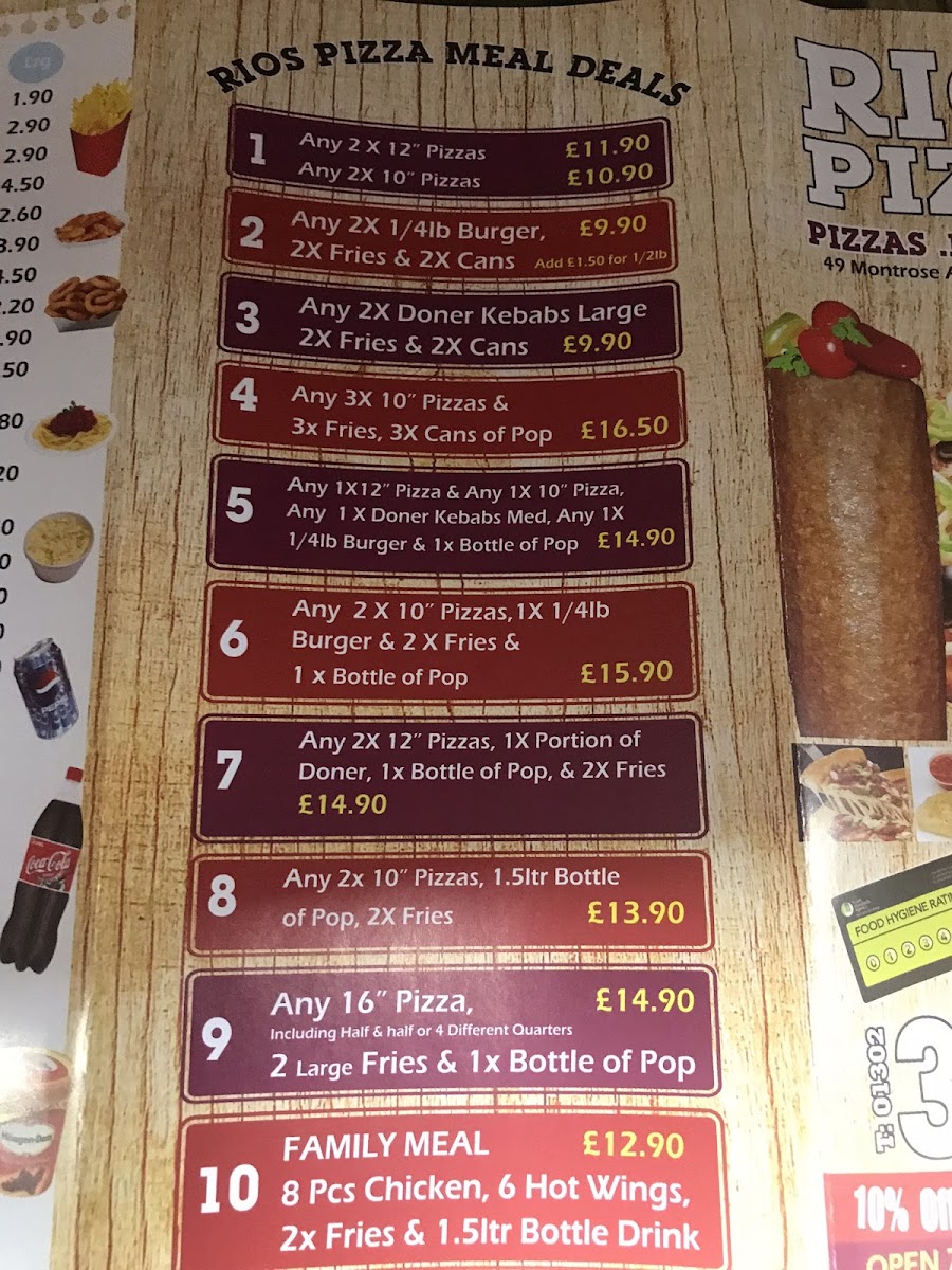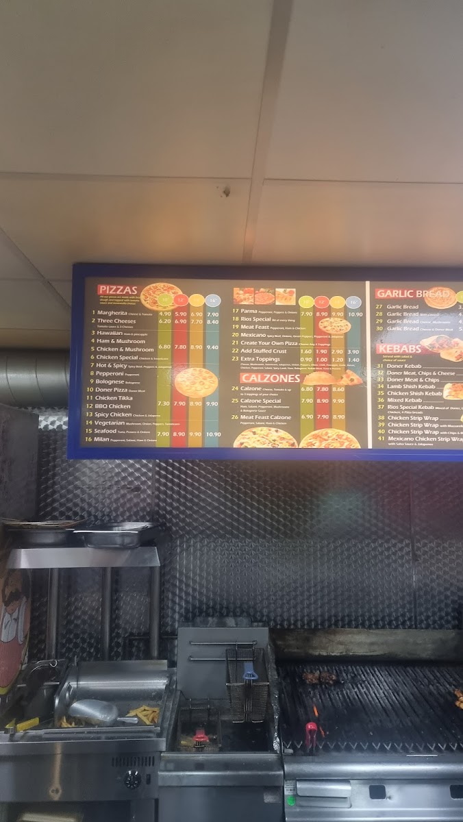 Rios Pizza Doncaster offers a diverse and appealing menu, with something for every craving. For pizza lovers, there's a selection of 10", 12", 14", and **16" pizzas, with popular options like the classic Margherita, Three Cheeses, Hawaiian, Ham and Mushroom, and Chicken and Mushroom pizzas. Calzone fans can enjoy various sizes, including the 10", 12", and 14" Calzones, with a special version also available. For garlic bread enthusiasts, there are choices ranging from 10" to 14" sizes, including a Garlic Bread with Cheese option. The menu extends beyond pizza, offering kebabs like the Large Doner Kebab and Large Chicken Doner, as well as tasty sides like Chips and Chips with Cheese. There's also a dedicated section for kids, featuring meals like the Kids 3pcs Chicken Strips Meal and a 7-inch Pizza for Kids Meal. Burgers include options like the Quarter Pounder Cheese Burger and Half Pounder Plain Burger, alongside fried chicken meals with combinations such as 2pcs Chicken with Chips or 8pcs Hot Wings with Chips and Drink. Special meal deals like Meal Deal 1 (choose a 10-inch or 12-inch pizza) and Meal Deal 2 (either a Quarter Pounder or Half Pounder Burger) offer great value. For dessert, indulge in a 500ml Ben and Jerry’s Ice Cream or Chocolate Cake. To top off the meal, a refreshing Yazoo Milkshake or a large bottle of Coke or Pepsi is available. The variety and reasonable prices make Rios Pizza Doncaster a great choice for any occasion.